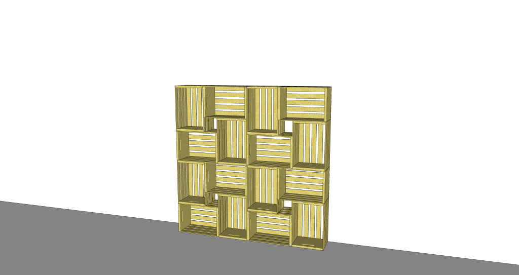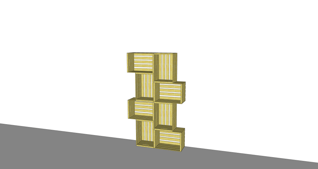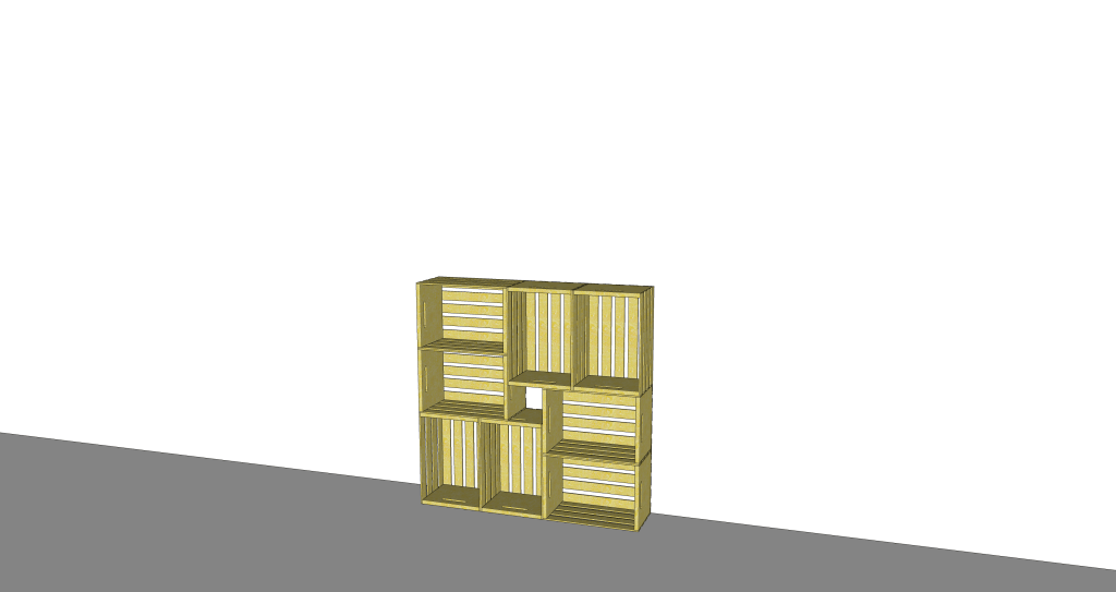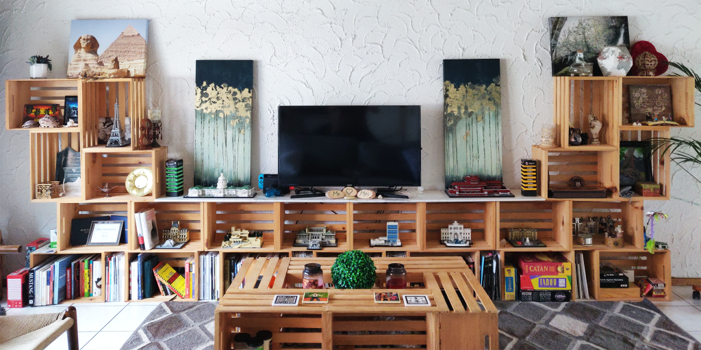 Instead of permanent glue, we utilize small wood screws to hold our crates in place. This mechanical fastening allows us to easily remove and re-arrange as needed. Small screw holes remain, which provides character to the wood as the furniture evolves (and is rarely noticed when things are on the shelves). Our creative juices can flow, and our living area can evolve to meet our needs!