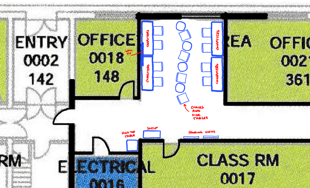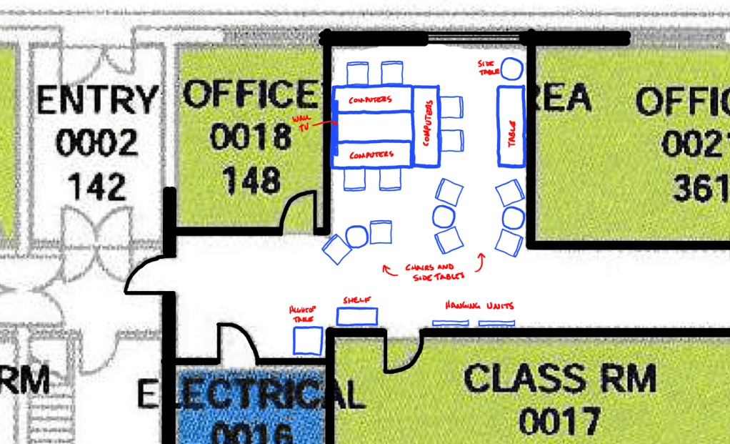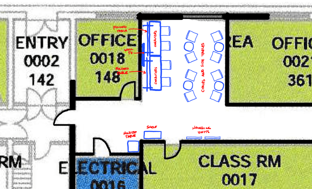 In a quick, down-and-dirty sketch exercise, I aided an organization in visualizing how to use a single space for multiple uses. They had an under-utilized common area in their building in which they wanted to accomplish various functions:
